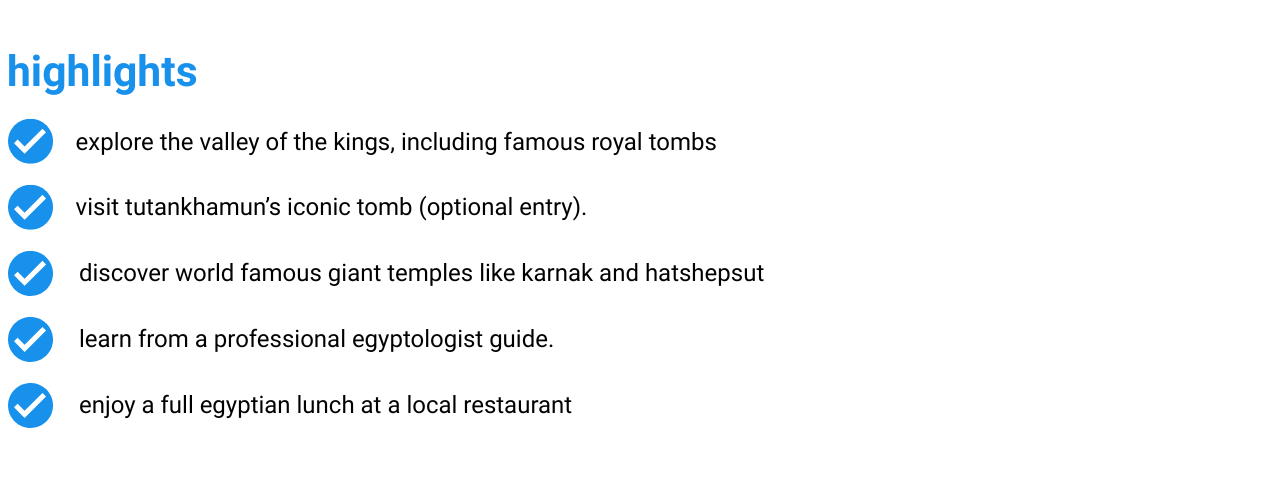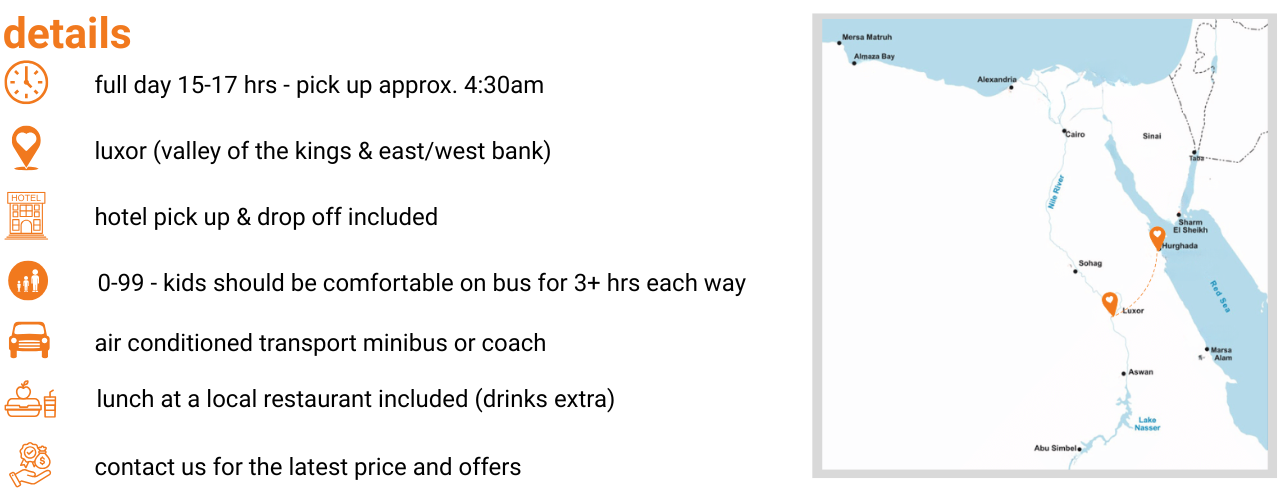 Luxor is ancient Egypt at its most powerful and impressive. It feels like walking through history: towering temples, hidden tombs, carvings that tell stories thousands of years old, and statues so huge it’s hard to believe they were built by hand. Standing in the Valley of the Kings is a moment you never forget — especially when you step inside Tutankhamun’s tomb and see the place that changed history forever. This tour takes you through both sides of the Nile — the West Bank and East Bank — with a professional Egyptologist guiding you through every detail. It’s a long day, but every moment is filled with incredible sights, stunning history, and memories you’ll carry for life. Luxor is one of those places everyone should see at least once.